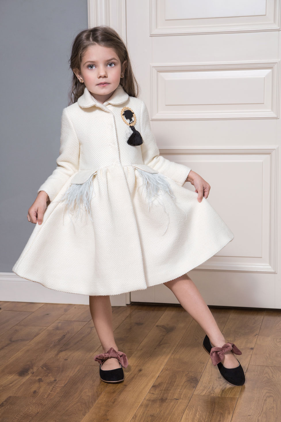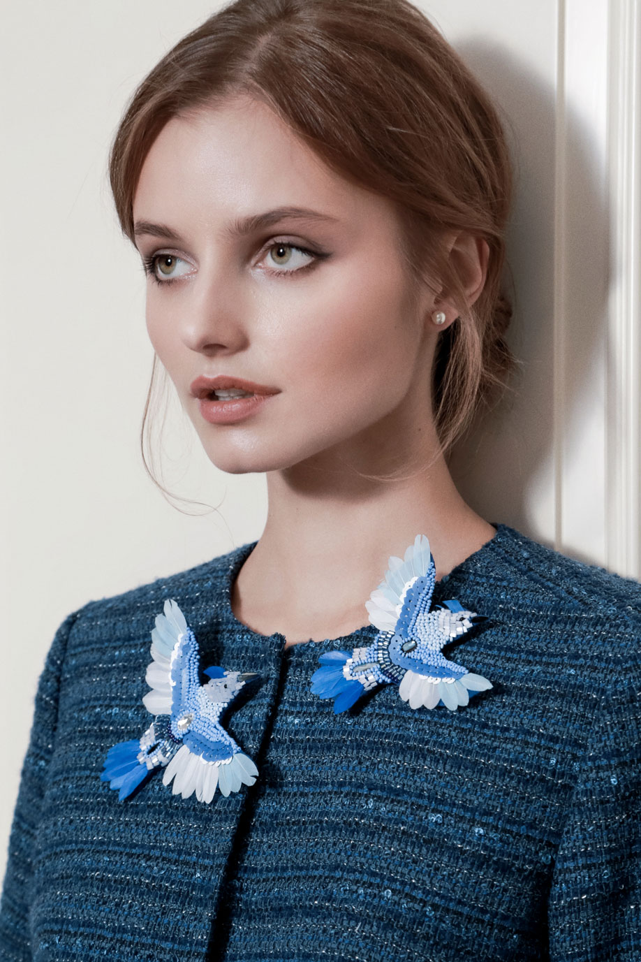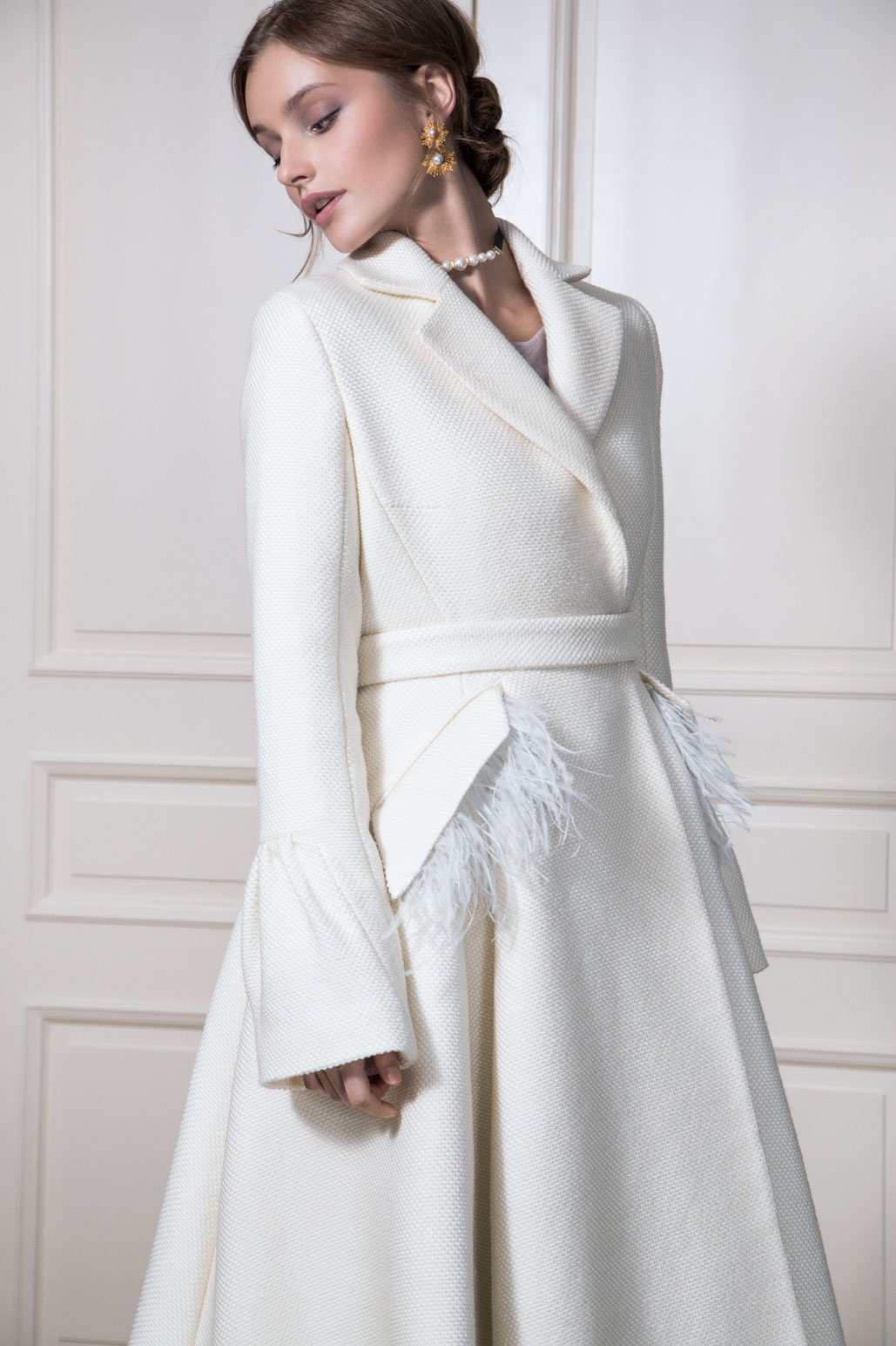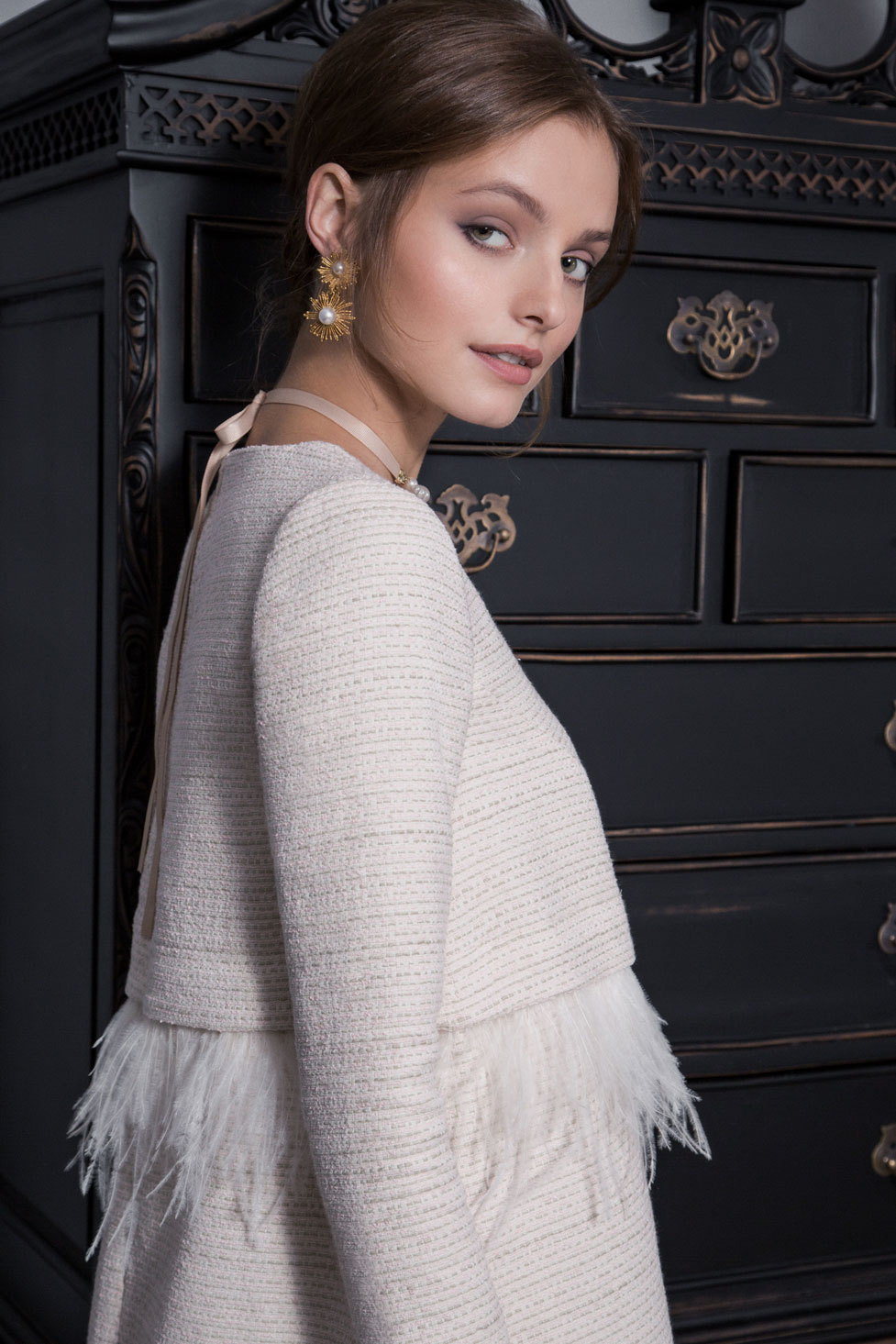 В качестве декора выбрали страстные перья и броши ручной работы. Сочетание деликатных тканей и изысканных моделей придает коллекции шарм и окунает нас в эпоху правления английской королевы Елизаветы ||.