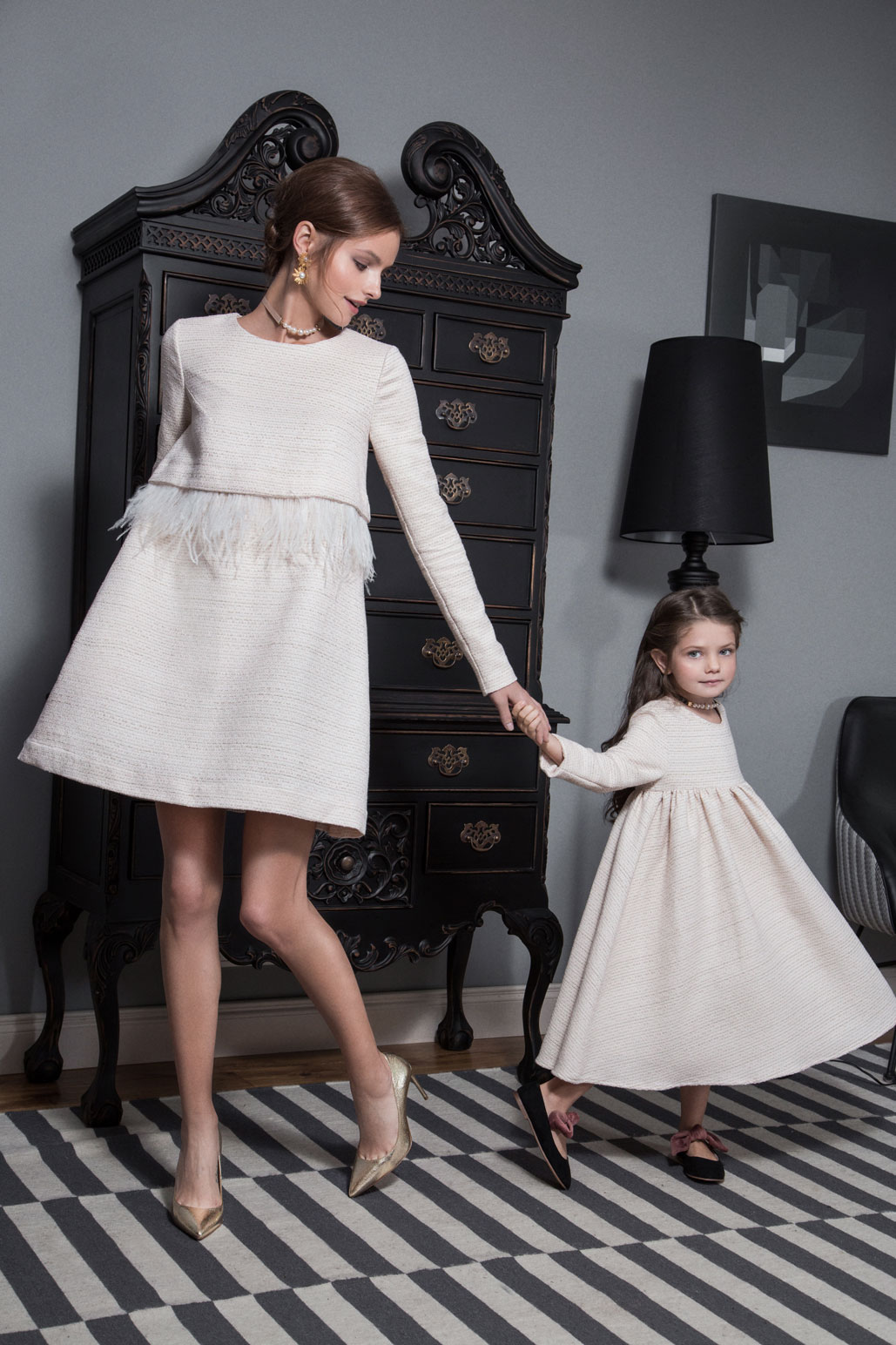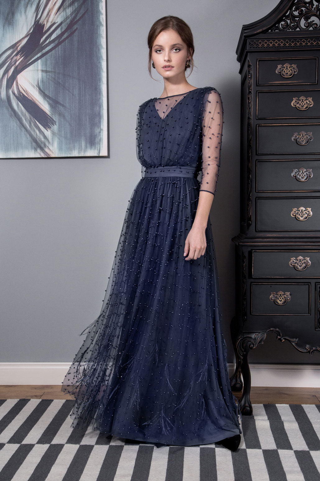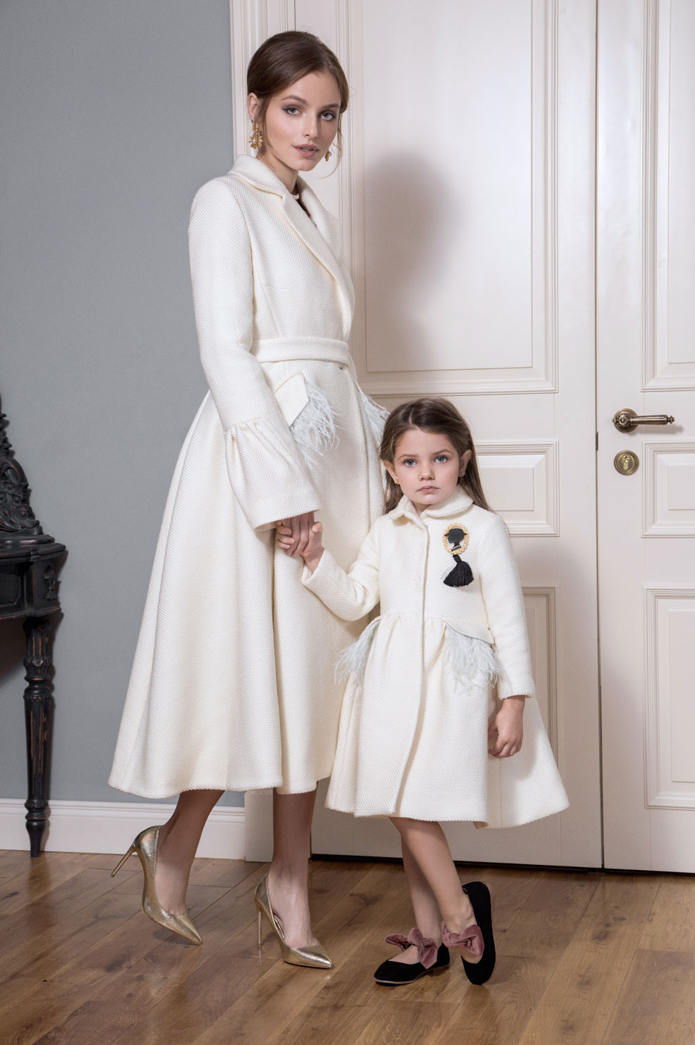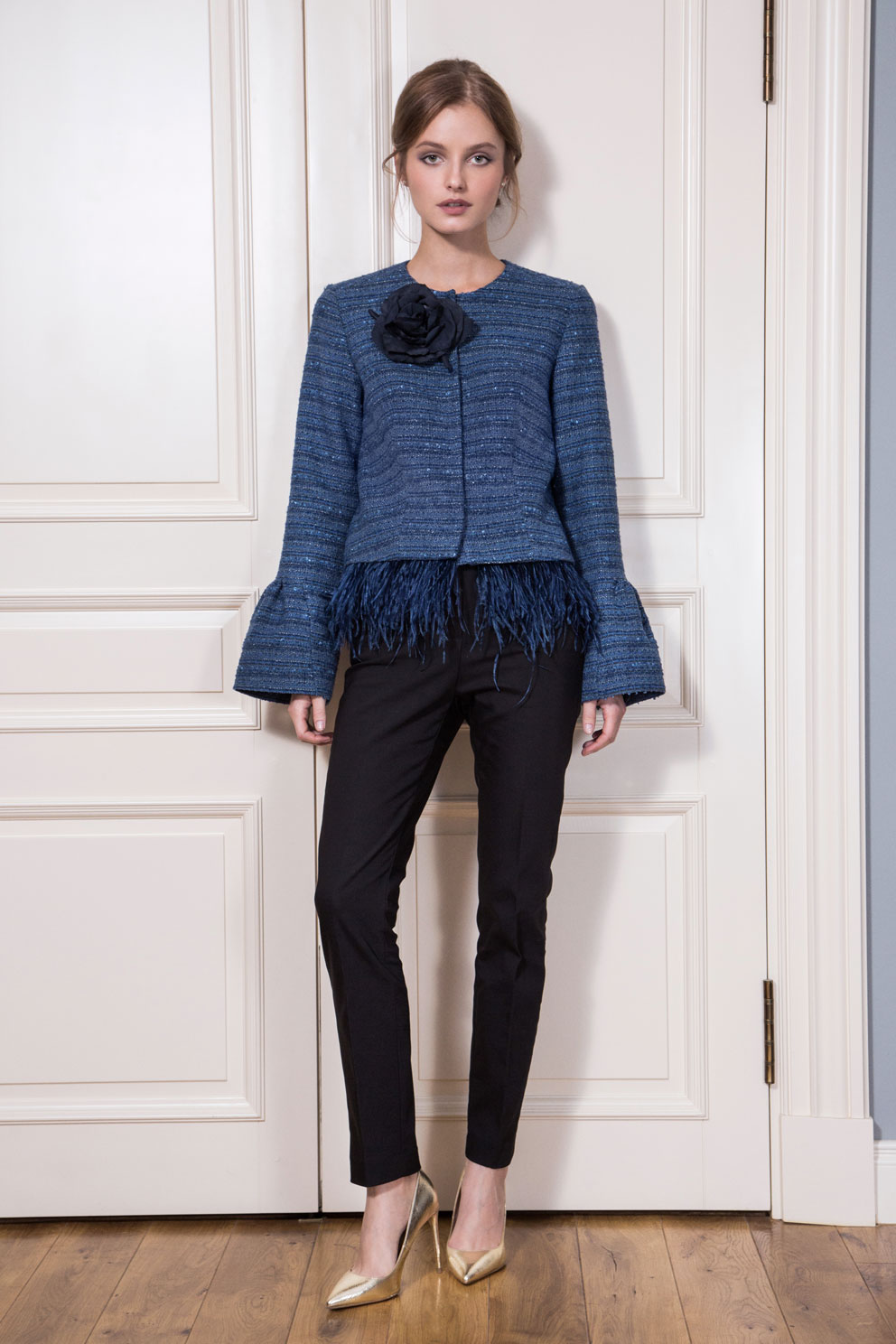 В качестве декора выбрали страстные перья и броши ручной работы. Сочетание деликатных тканей и изысканных моделей придает коллекции шарм и окунает нас в эпоху правления английской королевы Елизаветы ||.